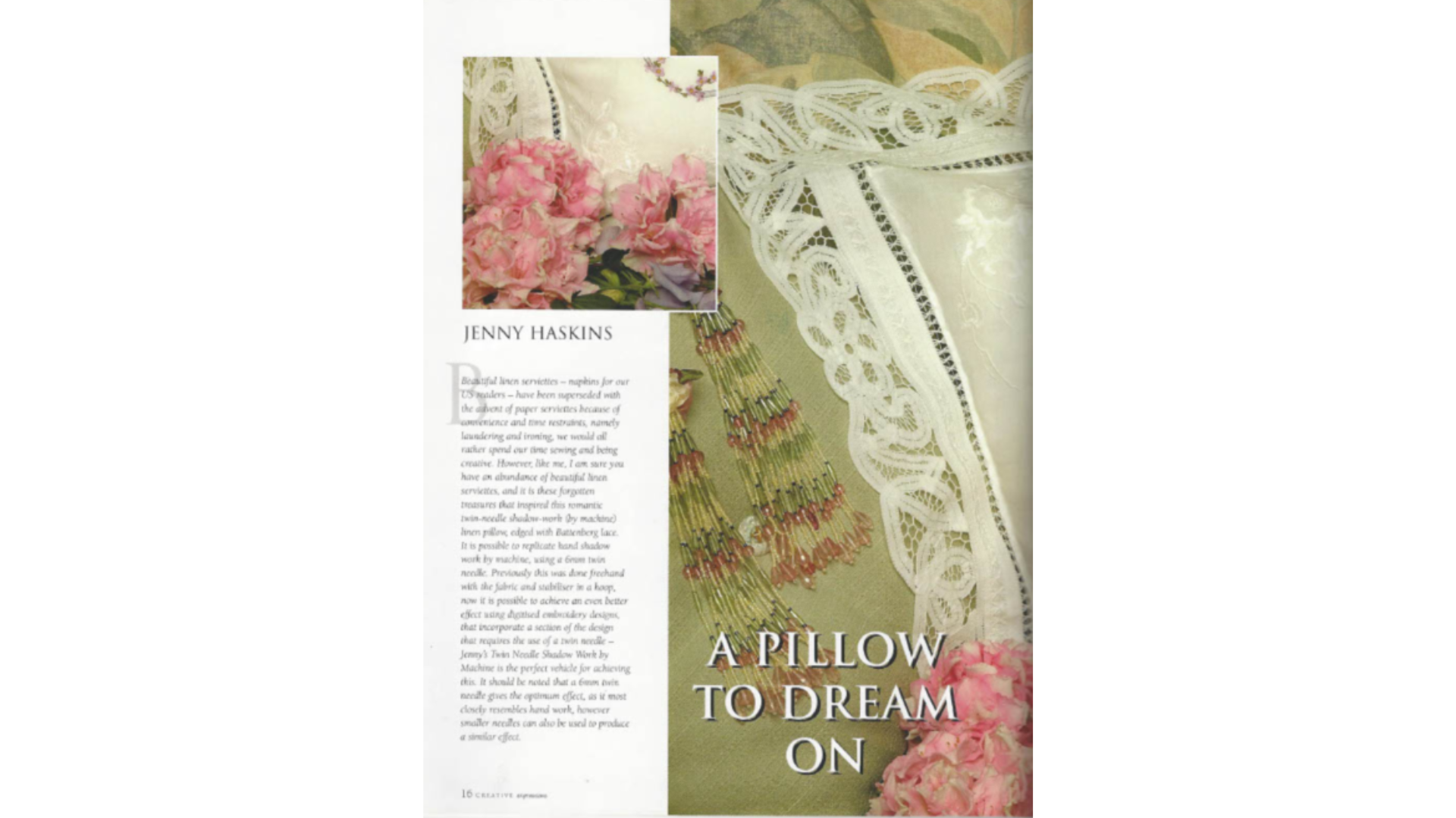 Instructions by Jenny and Simon Haskins Click here to download A Pillow to Dream On This project is taken from Creative Expression with Jenny Haskins that is no longer in print. Emails and offers that were a part of the project at the time of printing may no longer be available Click here to purchase any designs by Jenny Haskins